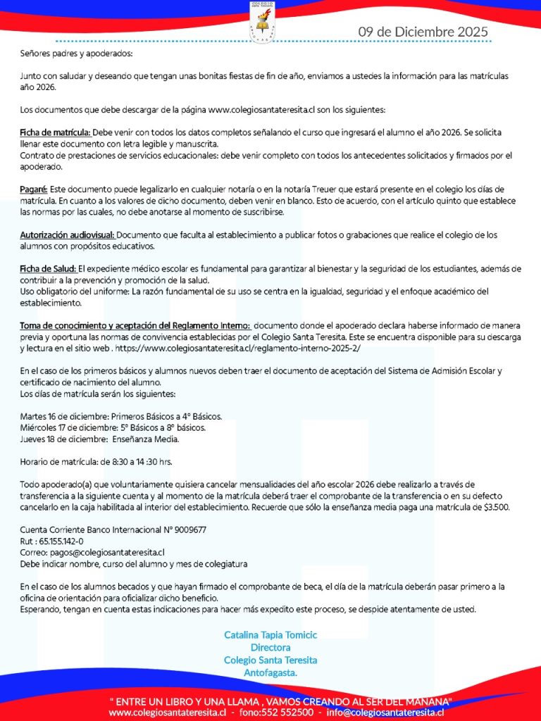 Dejamos a disposición el Kit de Matricula para su descarga: debe venir completo con todos los antecedentes solicitados y firmado por el apoderado.